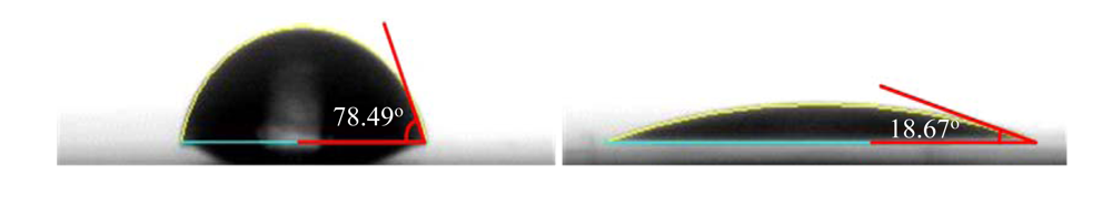 The overall process flow is shown in Figure 2(b) while the parameters are detailed in Table 1. Firstly, the flexible aluminum sheet is cleaned with ethanol and then blow-dried with nitrogen. Then atmospheric plasma is used to make the surface of the aluminum sheet more hydrophilic, to improve the adhesion of the ZnO solution on the aluminum sheet. The aluminum sheet is placed onto the stage of the plasma equipment. The plasma is sprayed by a nozzle whose orifice diameter is 4 mm. The orifice of the plasma spray nozzle is at a distance of 25 mm from the aluminum sheet. Figure 3 shows that the contact angle changes from 78.49° to 18.67° after the plasma modification.