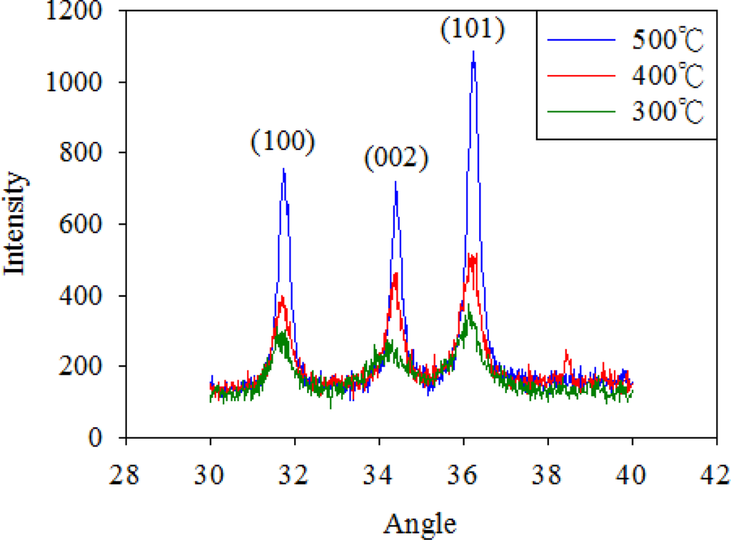 Figure 5 shows the X-ray diffraction (XRD) spectra of the ZnO films at different annealing temperatures, namely 300, 400, and 500 °C. The peaks at 31.88°, 34.58° and 36.38° are due to the diffraction from the (100), (002) and (101) crystalline plane of the quartzite structure of ZnO respectively, according to the peaks of standard ZnO (DBCard number: 01-075-6445). From the XRD measurement results, one could conclude that the lattice intensity increases as the annealing temperature increases. The pyroelectricity of ZnO is characterized by non-centro-symmetrical crystals and has a specific polar axis along the direction of spontaneous polarization. The internal polarization of ZnO will produces an electric field as it is subjected to temperature variation. Therefore, the lattice intensity will affect the pyroelectricity of ZnO and thus affect the sensor performance. However, the melting point of aluminum is about 660 °C. Therefore, this work anneals the ZnO film at 500 °C. The last step is to print the conductive nano-silver which serves as the top electrode. The inkjet printing parameters are detailed in Table 1. Figure 6 shows the finished flexible proximity sensor element.