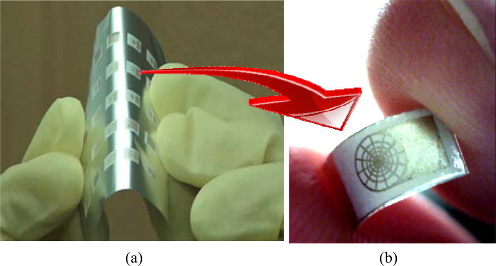 The flexible proximity senor elements: (a) a batch of flexible proximity sensors which are batch-manufactured on a flexile aluminum sheet; (b) a single flexible proximity sensor which is cut from (a).