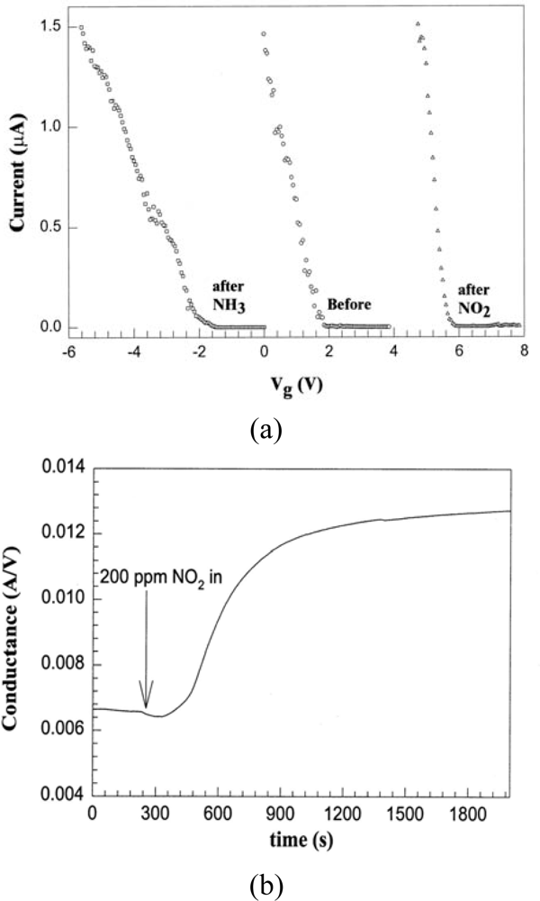 Sensing gas or organic vapor molecules is central to environmental monitoring, control of chemical processes, health protection and agricultural applications. For example, NO2, which can lead to respiratory symptoms in humans and dramatically affect agriculture, is produced from combustion or automotive emissions, and detection of NO2 is important to monitoring environmental pollution. SWNT-FET devices are ideal for monitoring environmental gases and organic vapors. SWNTs are entirely composed of surface atoms, which make their electrical properties sensitive to their chemical environment. Since semiconducting SWNTs are p-type under ambient conditions, electron-donating molecules such as NH3 that interact with SWNTs will result in charge-carrier (hole) recombination. This will cause a decrease in conductance and a shift in the transfer curve (IDS – VGS) to more negative voltages. However, electron-withdrawing molecules such as NO2 and O2 can increase hole concentration in the SWNT-FET and thus increase conductance, which leads to a shift of the IDS – VGS transfer curve to more positive voltages.