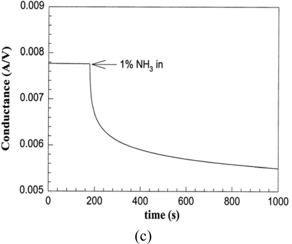 Chemical gating effects to the semiconducting SWNT. (a) Current versus gate voltage curves before NO2 (circles), after NO2 (triangles), and after NH3 (squares) exposure. (b) Time dependence of the conductance upon NO2 exposure. (c) Time dependence of the conductance upon NH3 exposure; Reproduced with permission from [11].