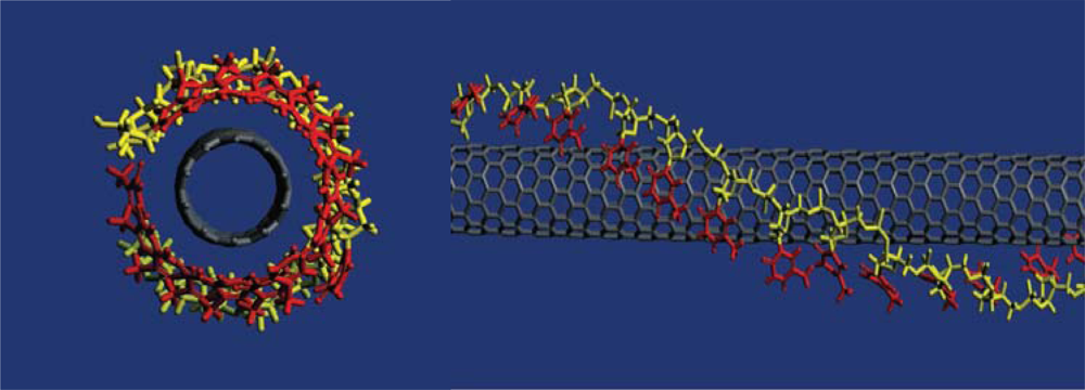 SWNT-FET sensors which measure DNA hybridization hold great potential for wide scale of genetic testing, clinical diagnostic and fast detection of biological warfare agents. Much attention has been given to the problem of interaction of CNTs and DNA with the purpose for the application in drug delivery and sensing. Nucleic acids including single-stranded DNA (ssDNA) and RNA can disperse SWNTs in water. Interaction of DNA and SWNT in water is due to nucleic acid base π-stacking on the nanotube surface, resulting on the hydrophilic molecular part pointing to the outside. ssDNA has been demonstrated to interact non-covalently with SWNTs [44,45] and form a stable hybrid with individual SWNTs by wrapping around them by means of the aromatic interactions between nucleotide bases and SWNT sidewalls. Molecular modeling suggests that ssDNA can bind to carbon nanotubes through π-stacking, resulting in helical wrapping to the surface (Figure 2). This interaction is dependent on the DNA sequence, which is used for structural separation of SWNTs. Zheng et al. demonstrated that bundled SWNTs are effectively dispersed in water by sonication in the presence of ssDNA; these DNA-coated SWNTs can be separated into fractions with different electronic structures by ion-exchange chromatography [46,47]. In addition, theoretical research shows that double-stranded DNA (dsDNA) molecules can interact with SWNTs as major groove binders.