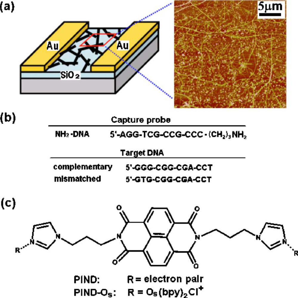 (a) Schematic illustration of the network devices and a typical atomic force microscope image. (b) Sequences of the synthetic oligonucleotide. (c) Structure of PIND and PIND-Os intercalators; Reproduced with permission from [50].