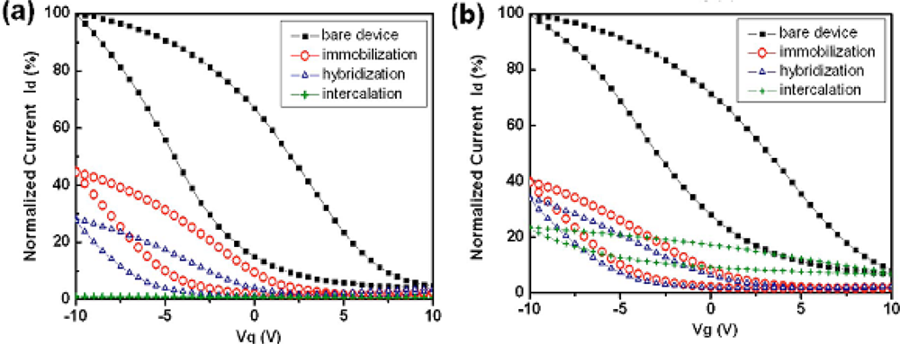 Typical gate voltage dependence of the normalized drain current IDS for (a) hybridization with complementary target analyte and (b) hybridization with single-base mismatched target analyte; Reproduced with permission from [50].