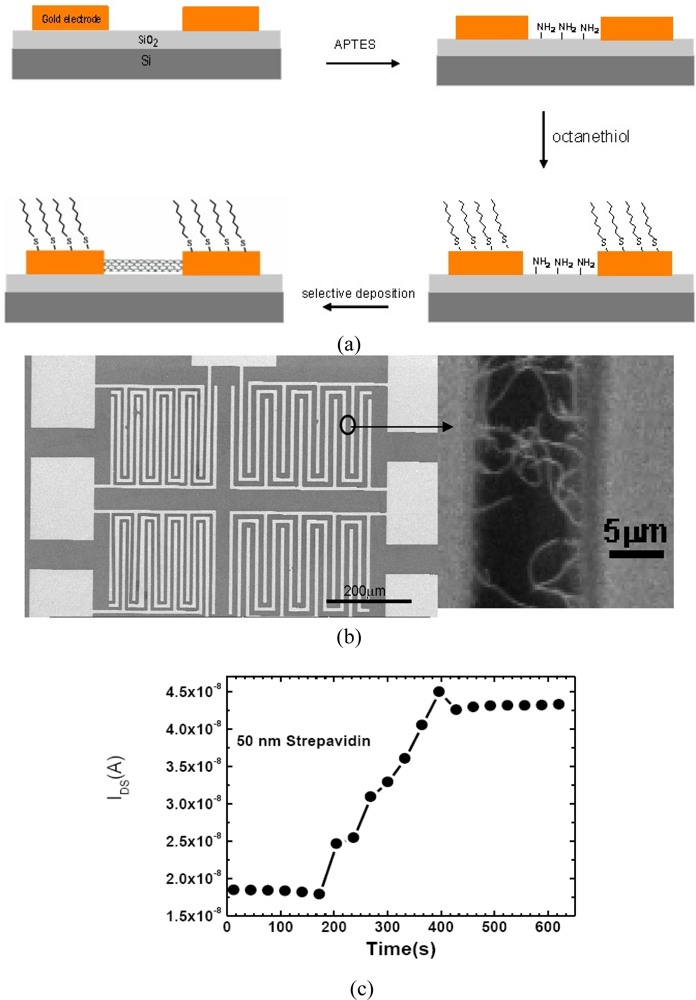 Star et al. [62] fabricated SWNT-FET biosensors with a back gate, which showed sensitivity to streptavidin by using individual biotin-functionalized SWNTs. The SWNT in the CNT FET device was coated with a mixture of poly ethyleneimine (PEI) and poly (ethylene glycol) (PEG). The PEI provided amino groups for the coupling of biotin-N-hydroxysuccinimidyl ester and the PEG prevented the NSB of proteins on the functionalized SWNT. The drain-source current dependence on the gate voltage showed a significant decrease upon streptavidin binding to the biotin-functionalized SWNT. The experiments revealed that specific binding of streptavidin occurred only at the biotinylated interface. The sensing mechanism was explained in terms of the effect of the electron doping of the SWNT channel upon the binding of the charged streptavidin molecules. Hu et al. observed a reverse change in the electrical monitoring of biotin-streptavidin interaction using SWNT-FETs [64]. A large area SWNT-FET was fabricated by a self-assembled method whereby the electrode surface and the area between electrodes were modified with nonpolar groups (CH3) or polar groups (NH3). The SWNTs were selectively placed in the area between the electrodes (Figure 5). The drain-source current at a fixed gate voltage showed an obvious increase upon the binding of streptavidin onto the biotin functionalized SWNT-FET. This increase in conductance upon addition of streptavidin is consistent with binding of negatively charged species to the surface of a p-type SWNT since streptavidin (with an isoelectronic point pI between 5 and 6) is negatively charged at the pH of the measurements (pH 7.2). The sensing mechanism is consistent with electrolyte gating rather than charge transfer as in the work of Star et al. Furthermore, Hu et al. studied the specificity and real-time detection of the as fabricated CNT-FET biosensor by using bovine immunoglobulin (IgG) as a control protein.
