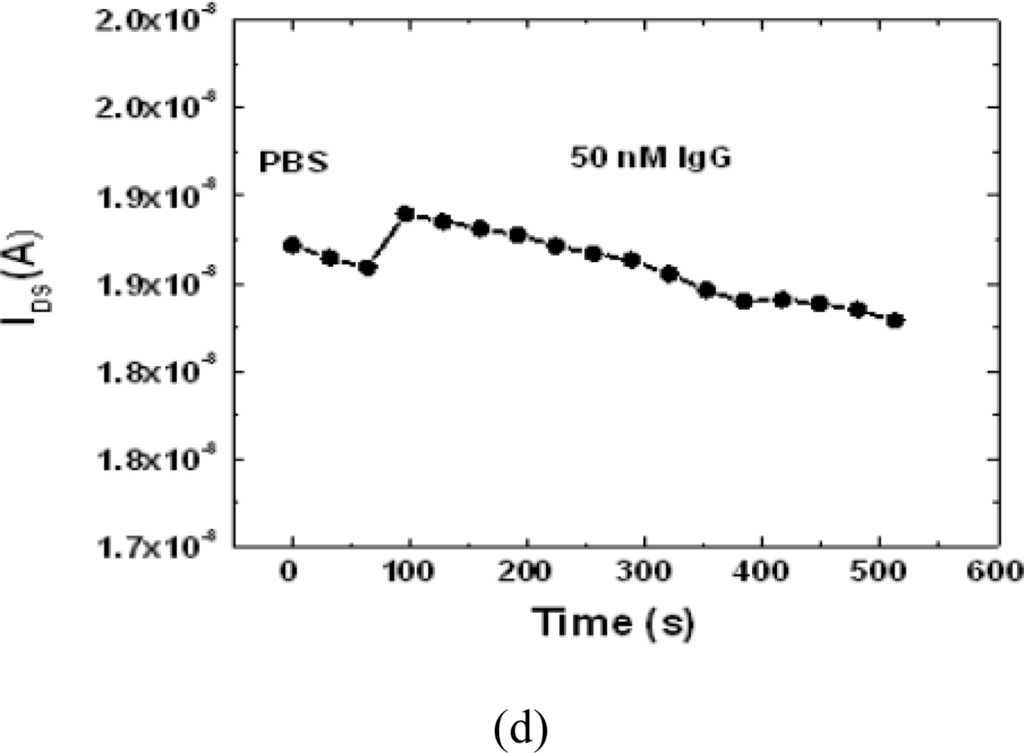 The typical transfer curves for SWNT-FET immobilization with NH2-DNA was compared with respect to corresponding bare devices (Figure 4a). The SWNT-FET hybridized with the complementary target DNA show a relatively large current reduction as compared to those hybridized with single-base mismatched target DNA The significant reduction in IDS for complementary hybridization indicates the formation of a double-stranded DNA which may lead to the increase of scattering centers on semiconductor channels or to shifts in Au work function further away from the valence band of carbon nanotubes. The sensing mechanism of electrical detection of DNA for this network SWNT-FET was further investigated, showing that sensing of DNA is dominated by the variety in metal-SWNT junctions rather than the channel conductance [51]. Maehashi et al. reported high sensitive CNT-FET sensor using peptide nucleic acid (PNA) oligonucleotides as the probe, the detection concentration reached as low as 6.8 fM [52].