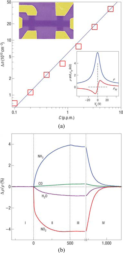 Novoselov et al. demonstrated a graphene-based sensor with a detection resolution of an individual gas molecule, which is the first reported chemical sensor with the ultimate limit [98]. The graphene devices were prepared by micromechanical cleavage of graphite on an oxidized Si substrate, followed by fabrication of Ti/Au electrodes using electron beam lithography (Figure 7a). To assess the effect of gaseous chemicals on the graphene device, the response to NO2, NH3, H2O and CO with a fixed concentration of 1 ppm was measured. In Figure 7b, region I corresponds to the device before exposure to chemicals. Obvious changes occurred within 1 minute of exposure (Figure 7b, region II) and then the response was followed by a saturation region (Figure 7b, region III). The device can be recovered to the undoped state by annealing in vacuum (region IV). The concentration (Δn) of chemically induced charge carriers as a function of gaseous concentration (C) was investigated by measuring the changes in longitudinal (ρxx) and Hall (ρxy) resistivity. The results showed that Δn depended linearly on the concentration of an examined chemical under the same exposure conditions, which is proposed to simplify the use of graphene-based sensors in practical applications.