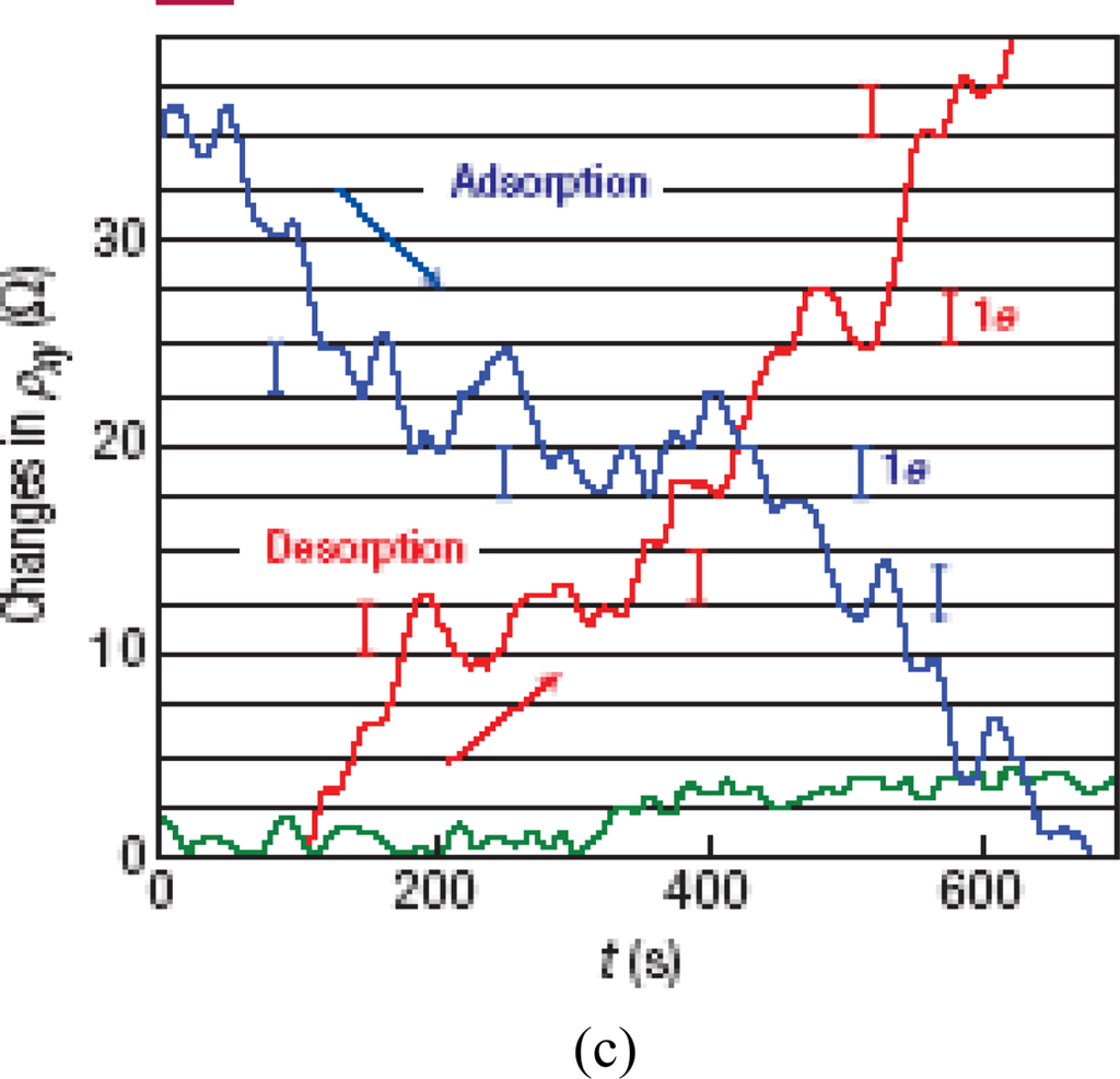 To monitor the fundamental limit of graphene gas sensors, a series of techniques were exploited including high driving currents for suppression of the Johnson noise, annealed devices close to the neutrality point, and few-layer graphene devices with low contact resistance. Electrical signals from single-molecule were observed with the above operations (Figure 7c), revealing the adsorption and desorption of individual gas molecule. The chemically induced changes in ρxy occurred in a step-like manner when the device was exposed to diluted NO2. Similar variations on the opposite direction were observed upon stopping NO2 supply and starting to evacuate the sample chamber.