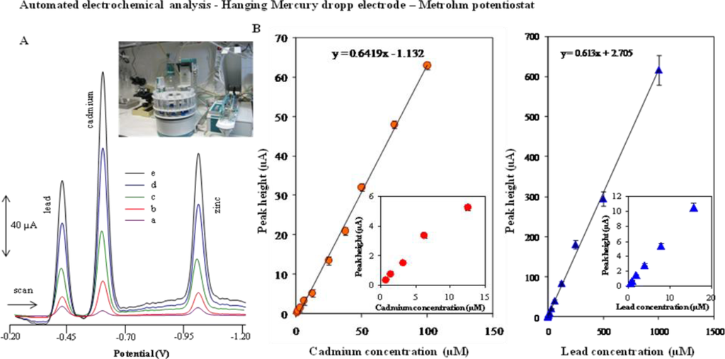 In spite of the fact the capability and sensitivity of analytical instrumentation have increased in recent years, the routine determination of trace metals in complex media, such as lake water, is still difficult [49]. There are at least two challenging areas in trace metal analysis, being the speciation of inorganic and organic forms; and the trace and ultra trace determination in complex matrices, such as biological fluids and tissues, environmental materials and oils. For these purposes low cost and readily portable sensors and biosensors can be used [23–26,50–60]. In the present study we report on the use of several electrochemical instruments to detect cadmium(II) and lead(II) ions. Considering the fact that we used a homemade micropotentiostat and carbon tips as a working electrode, we proposed an easy-to-use and low cost apparatus still sensitive enough to analyse real samples such as tissues of plants and waters.