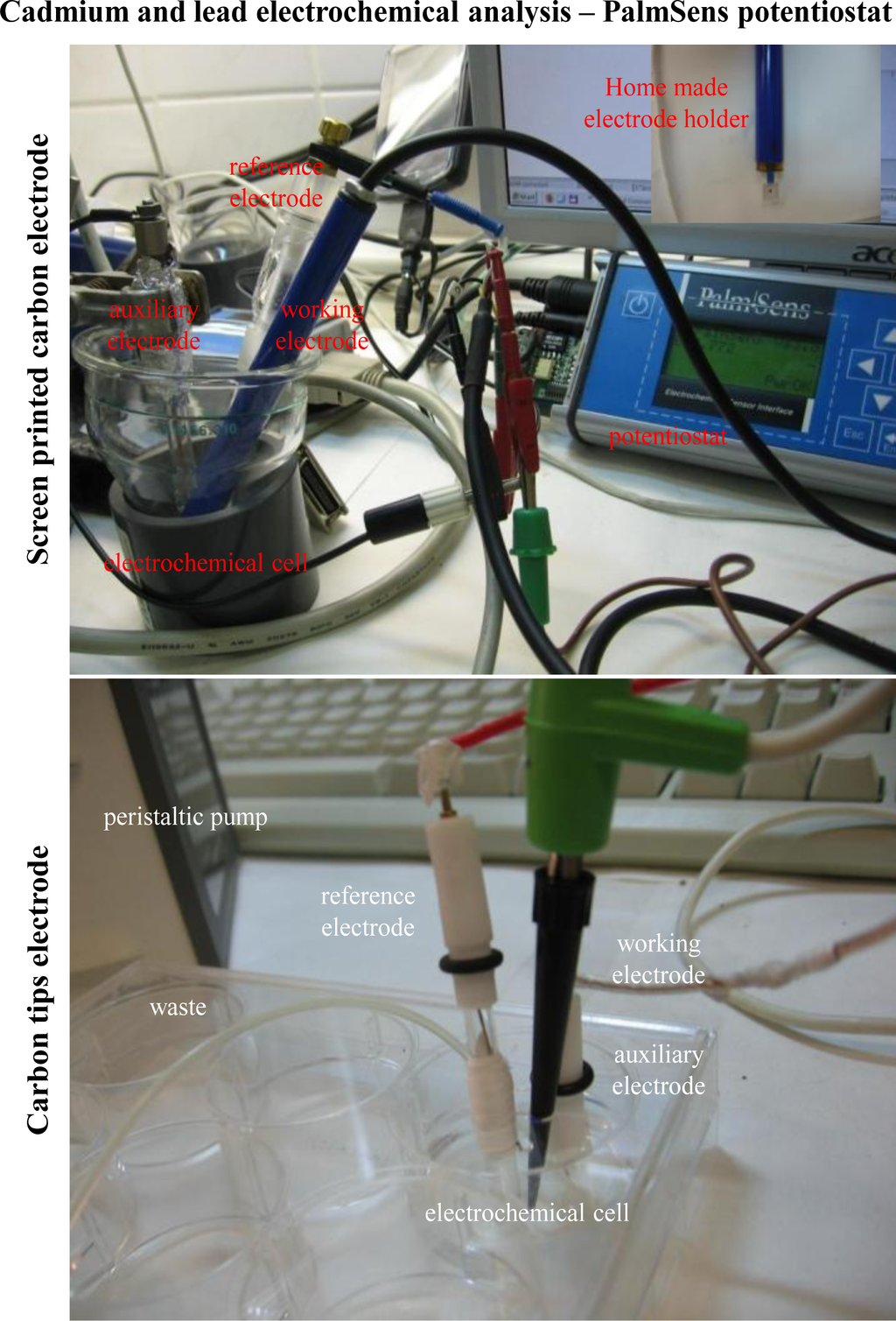 Based on the aforementioned facts, we tested two miniaturized electrode systems, both connected to a PalmSens potentiostat, for detection of cadmium and lead ions (Figure 2). The first system uses screen-printed carbon electrodes (Figure 2A) and the second commercially available pipette tips (Figure 2B).
