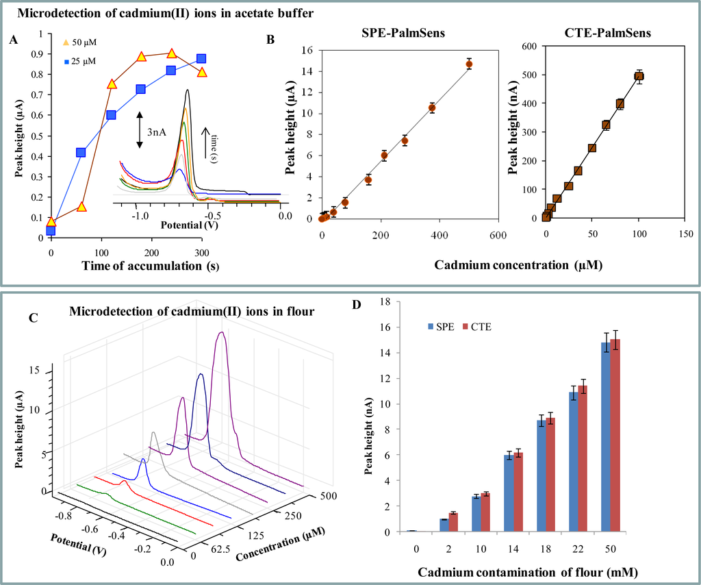 Differential pulse voltammetric detection of cadmium(II) ions at SPE and/or CTE connected to PalmSens potentiostat. (A) The dependence of cadmium(II) ions peak height on accumulation time (concentration of Cd(II) is 20 μM), in inset: typical DP voltammograms of cadmium(II) ions measured at various times of accumulation with CTE. (B, C) Calibration curves. (D) DP voltammograms of various concentrations of cadmium(II) ions measured with SPE. Experimental parameters were as follows: initial potential 0 V, end potential −0.8 V, potential step 5 mV.
