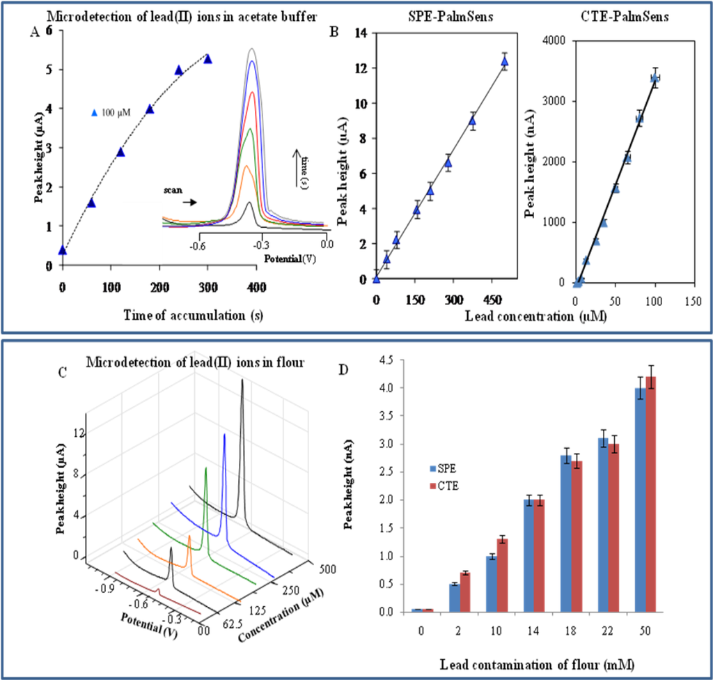 Microdetection of lead(II) ions at carbon tip. (A) The dependence of lead(II) ions peak height on time of accumulation, in inset: typical DP voltammograms of lead(II) ions under various times of accumulation. (B) Calibration curve. (C) DP voltammograms of various concentrations of lead(II) ions. (D) Detection of lead(II) ions in contaminated flour.