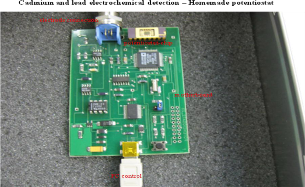 For the next experiments we fabricated a simple micropotentiostat [45]. The apparatus consists of the 10 × 10 cm printed circuit board mounted with SMD devices (Figure 5). The potentiostat on a chip is built into this board. The apparatus is connected to a PC by a USB connector and basic instructions are transmitted into the chip thanks to a control program. Electrodes are connected with the micropotentiostat via a 3-way TRIAD connector.