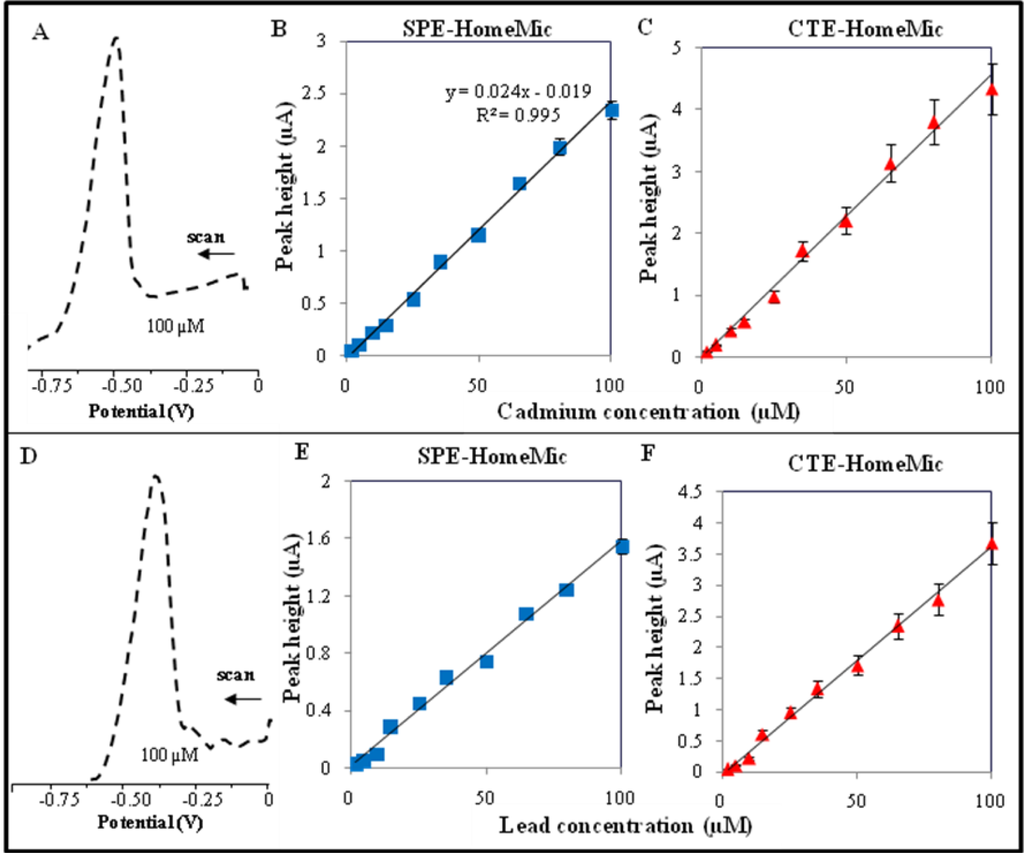 Cadmium(II) ions. (A) DP voltammogram of cadmium(II) ions detected at SPE. Calibration curves measured with (B) SPE and/or (C) CTE. Lead(II) ions. (A) DP voltammogram of lead(II) ions detected at SPE. Calibration curves measured with (B) SPE and/or (C) CTE. Poteniostat: homemade. Experimental parameters were as follows: initial potential 0 V, end potential −0.8 V, potential step 5 mV.