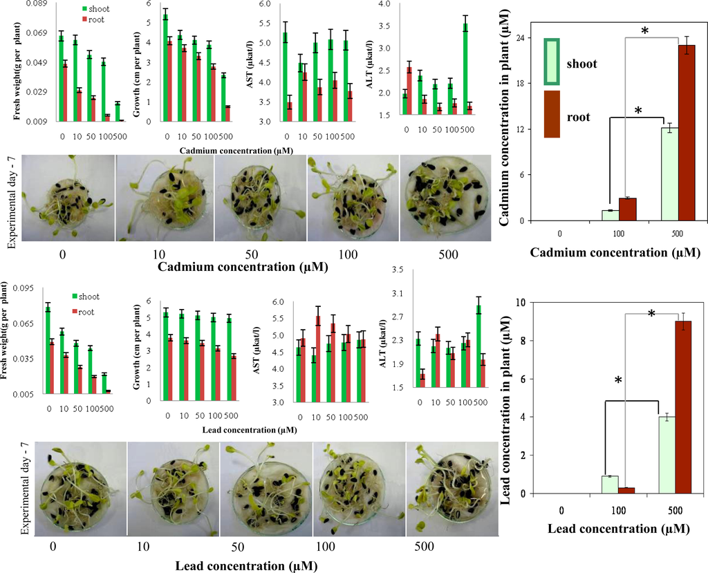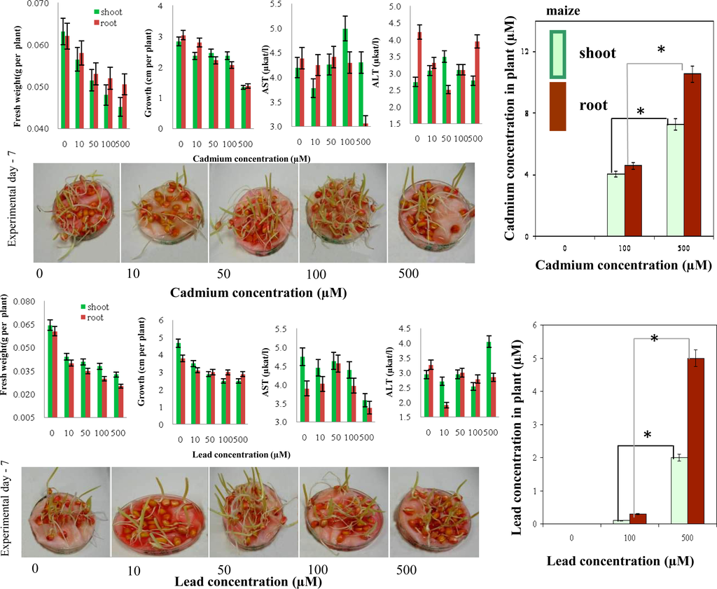 Maize seedlings were prepared like the above-mentioned sunflower seedlings. Both heavy metal ions had an adverse effect on fresh weight and growth of roots and shoots of the seedlings (Figure 8A, B). The effect of heavy metal ions on activities of ALT and AST was also negative. In almost all experimental groups the activities decreased or were similar to control plants. The content Cd(II) and/or Pb(II) of in plants treated with 10 and 50 μM was again under the detection limit of the instrument used as in the case of sunflower seedlings (Figure 8C, D). It follows from the results obtained that content of both metal ions enhanced significantly (*p < 0.05) with increasing concentration of a metal and time of the treatment. Higher content was determined in roots compared to shoots in case of both metal ions.