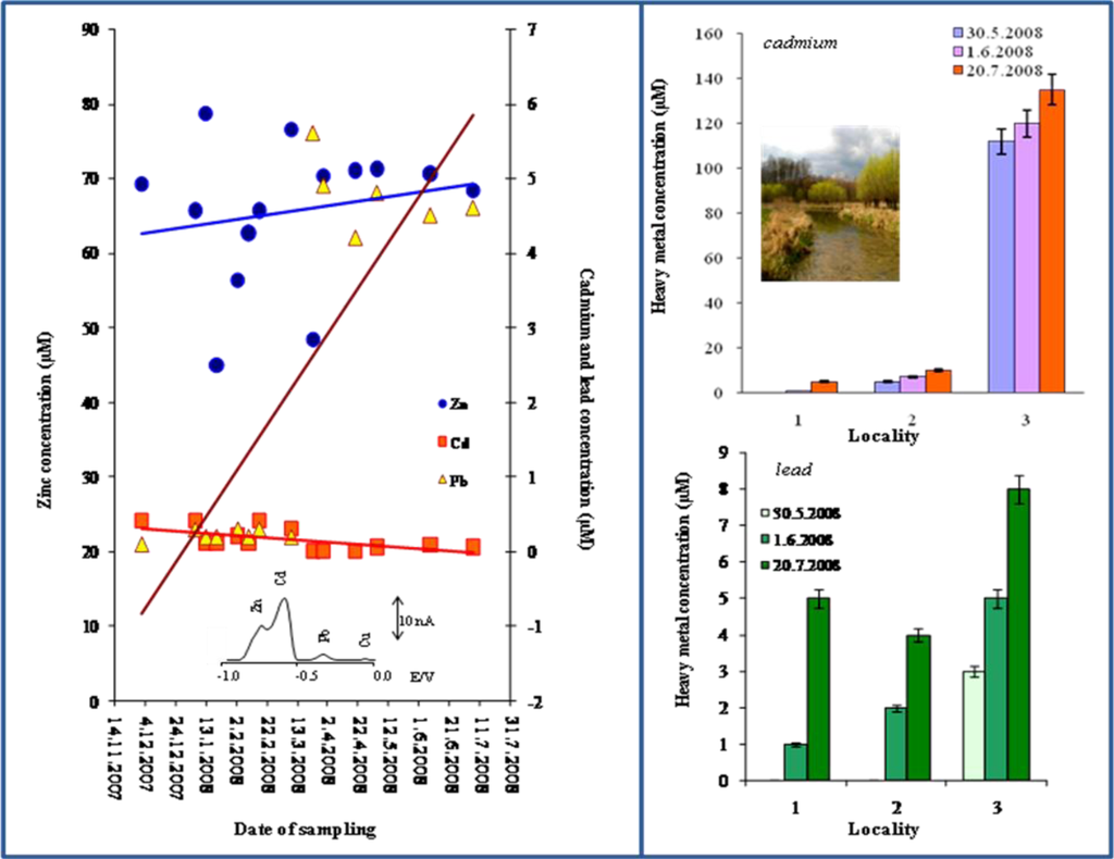 One of the most important aims of analytical chemistry is the monitoring of heavy metal ions levels in living environment. In situ analysis can bring a plenty of otherwise very hardly pursuable information and data. If we automate whole process of measurement, we have at our disposal a tool for on-line monitoring of environmental targets. It is clear that there is great demand on the ability of these instruments to carry out simultaneous analysis of target analysis. We attempted to detect cadmium(II) and lead(II) ions in rainwater (sampling times from 14th November 2007 to 31st July 2008, sampling place: Boritov, Czech Republic). Well developed and separated voltammetric signals at their characteristic potentials (Cd–0.6 V and Pb–0.4 V) were obtained (inset in Figure 9A). Moreover, we detected zinc(II) ions. The total amount of cadmium and lead was determined in units of μM (Figure 9A).