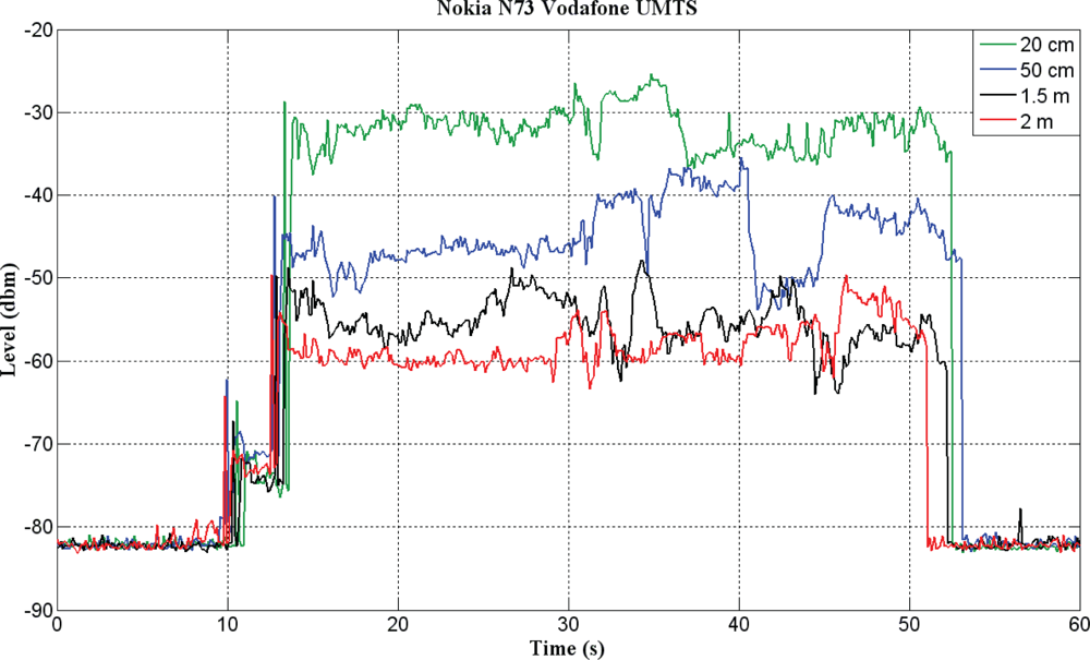 The voltage obtained with this system depends, among other factors, on the distance between the telephone and the antenna and the relative orientation between the two. Figure 5 shows a practical example of the energy captured from a mobile telephone over various open-air distances while a call is being made. When the telephone is not in use, the energy captured is minimal. When a call is made, this energy is inversely proportional to the distance between the telephone and the energy-capturing antenna. This voltage can be digitized by a microcontroller to enable subsequent application of a detection algorithm to estimate mobile telephone use.