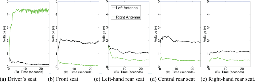 The system was tested in a car driven on the University of Alcalá campus. A Sony-Ericsson K800i mobile telephone subscribed to Spanish operator Movistar was used. Figure 7 shows system performance when a single mobile telephone was used inside the vehicle by (a) the driver, (b) the front-seat passenger, (c) the left-hand rear-seat passenger, (d) the central rear-seat passenger and finally (e) the right-hand rear-seat passenger.