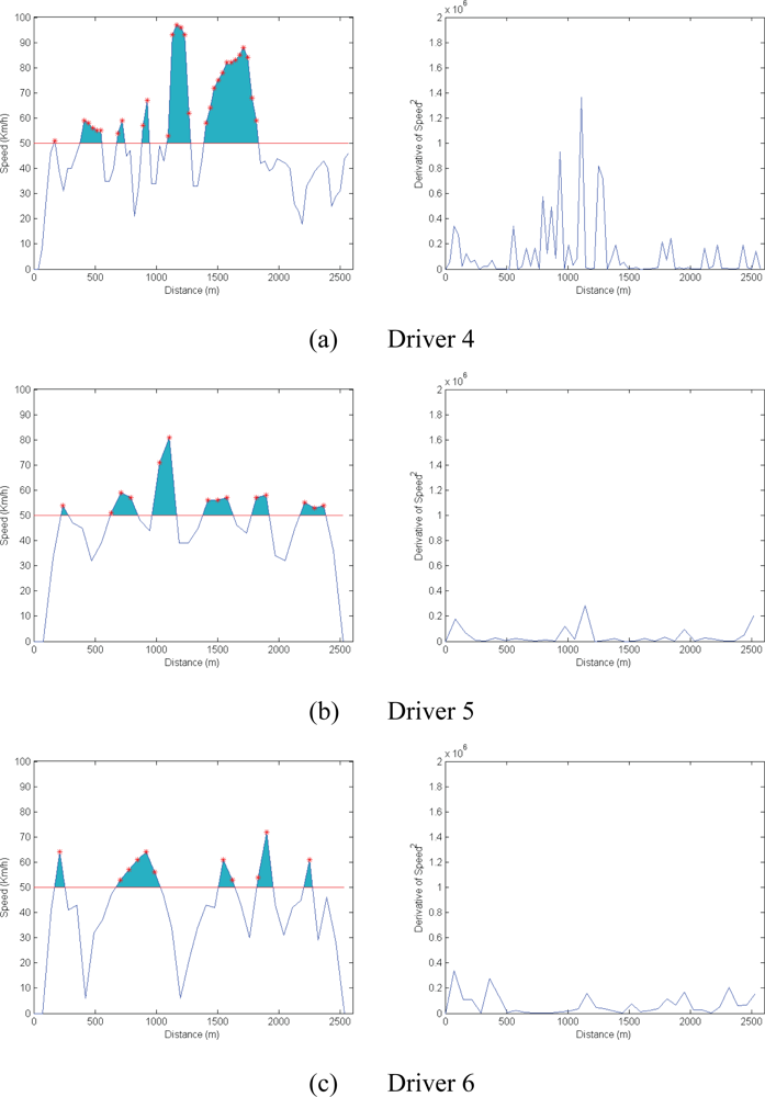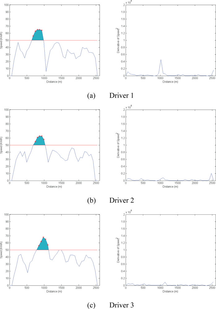 The test assessed the vehicle speed parameter, which was obtained from the GPS. Figure 8 shows the speed graphs for the first three drivers. These reveal that these drivers exceeded the speed limit for brief periods (shown in red) and drove non-aggressively (shown by the square of the derivative of speed, also in Figure 8).