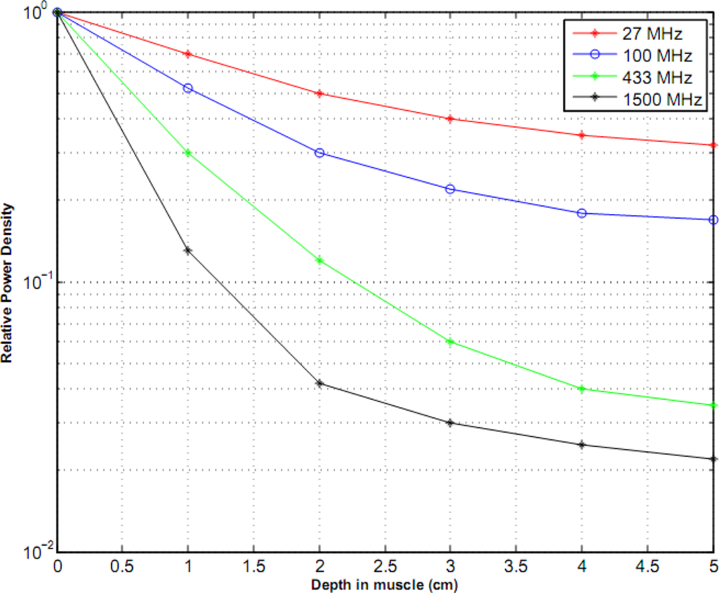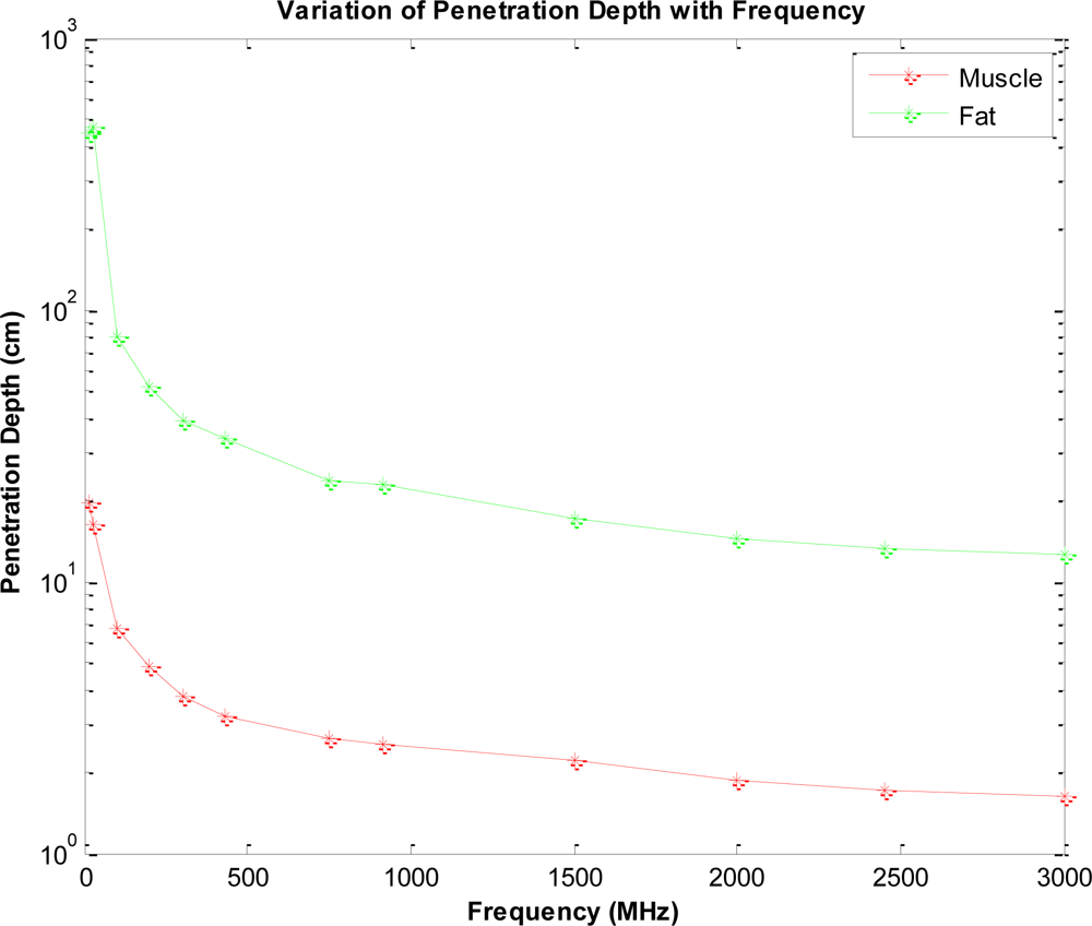 The permittivity and frequency may also determine how far the EM wave penetrates into the body. The term depth of penetration (Dp) usually quantifies this. For objects with homogeneous properties and with RFR incident at right angles to the surface, depth of penetration is defined as the distance at which the power density is decreased by absorption to about 0.13534 of the body’s surface value. However, the magnitude of the electric and the magnetic field reduces by a factor of 0.36788. Depth of penetration is defined as: