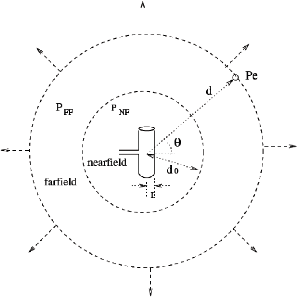These nodes exchange data among themselves and also with the base-station. In general, the system model consists of numerous biosensor nodes placed inside the various parts of the human body surrounded by tissues. In particular, for the development of this model, we consider only one transmitting and one receiving antenna separated by a distance d. An elemental short dipole (dipole length_wavelength) in a lossy human tissue medium is considered for this purpose [] and is shown in Figure 9. A small area of tissue surrounding the antenna is considered for our analysis. Thus we can safely assume the human tissue under consideration to be a homogeneous medium with no sharp edges, no rough surfaces and having uniform electric and magnetic properties. The received power is assumed to be due only to the power from the transmitter and not from any other source. The space around the radiating antenna is divided into near field and far field regions as shown in Figure 10.