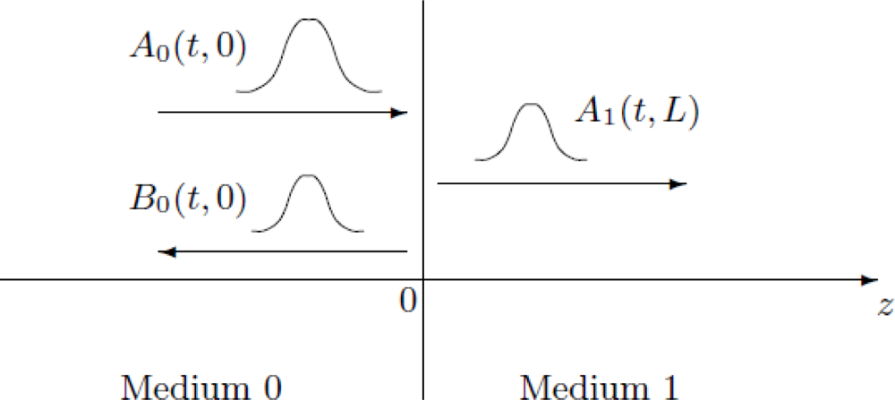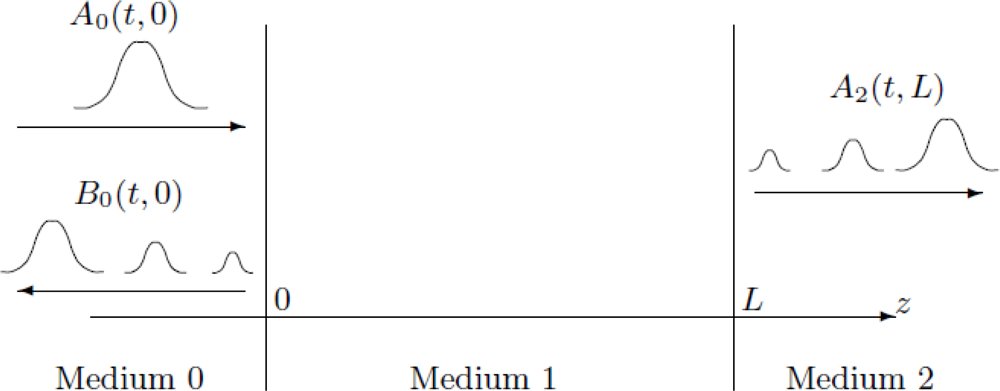 with j = 0 for z < 0, j = 1 for z ∈ [0, L], and j = 2 for z = L. The boundary conditions correspond to an impinging pulse at the interface z = 0 and a radiation condition at z = L2: