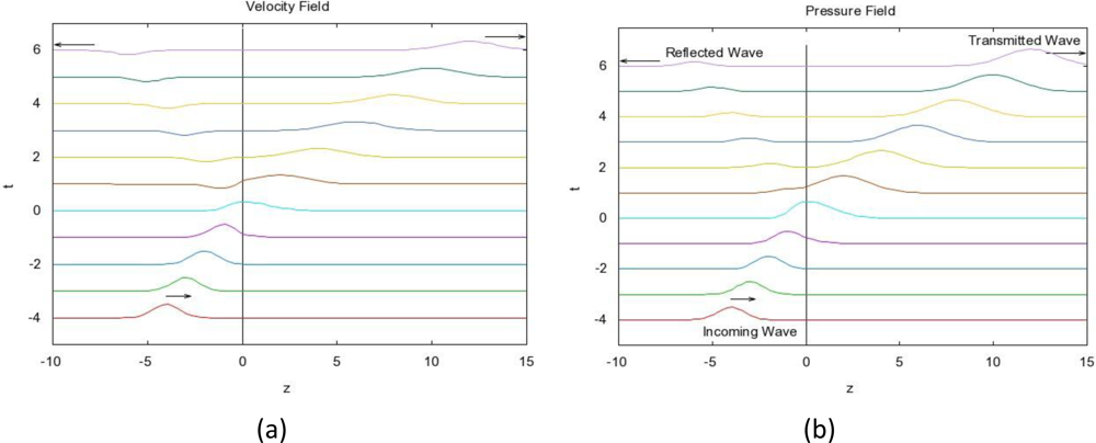 In terms of the right- and left-going waves, these two formulations give the same descriptions. We have A0 (t, z) = f(t − z/c0) for z < 0, and B1(t, z) = 0 for z > 0, and consequently, at the interface z = 0: