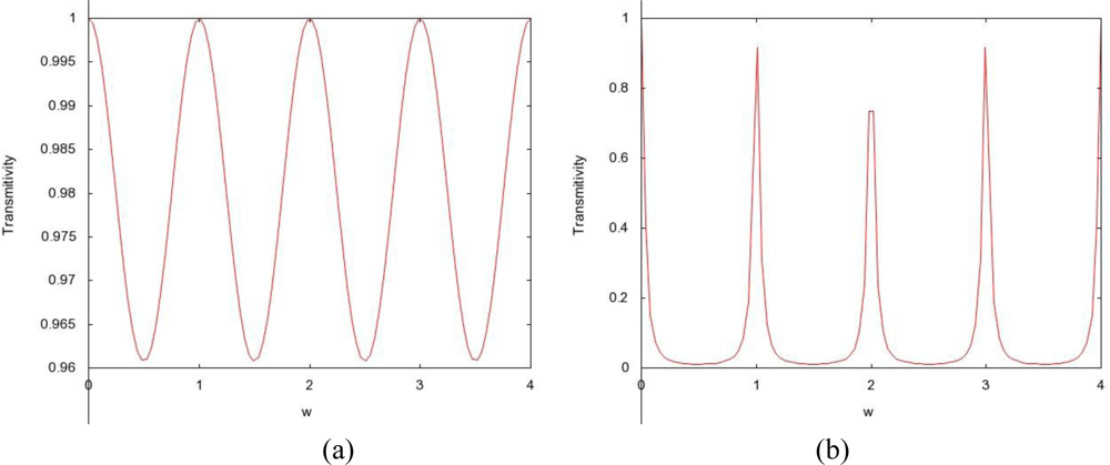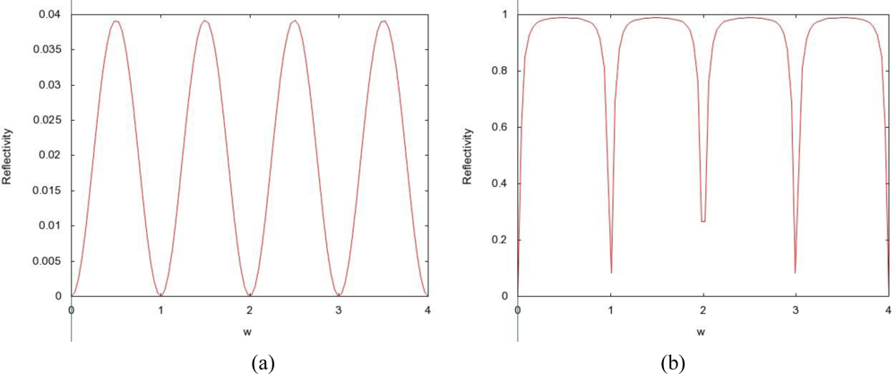 Reflectivity |̂(ω)|2 versus frequency for a single layer with R0 = −R1 = 0.1 (a) and R0 = −R1 = 0.9 (b). The period is ωc = πc1/L.