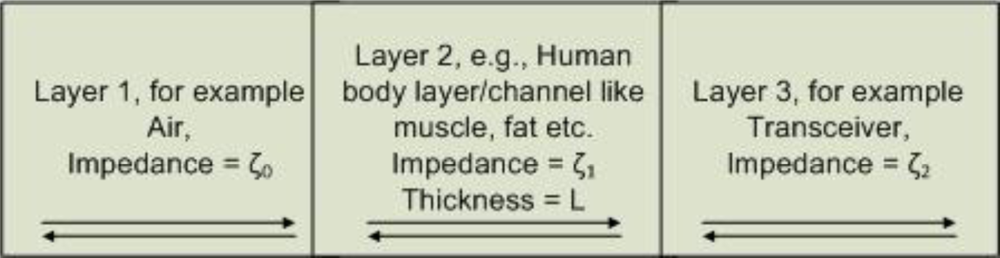 The total transmission phenomenon is also encountered in situations in which the two half-spaces are different. Indeed, consideration of human body part as an ideal, fully-transmitting layer is certainly beyond perfection. In a microscopic or constituent-wise sense, a human body-part, striated muscle for example, iscomposed of water (70.09%), ether-soluble extract (6.60%), crude protein (21.94%), etc. []. When one is faced with the task of modeling portions of human body as a medium for electromagnetic (signal) propagation, there are inevitable practical assumptions and approximations to be made. Thinner layers can be considered with more homogeneous characteristics, while for thicker setting with internal variability, the aggregate behavior sums up by and large. Thus a certain part of a human body like muscle or fat, when considered in macroscopic perspective, can be regarded as a continuum, and hence the idea of a planner-layered-medium assumption of human body tissues contextually holds for all practical modeling considerations. Such model could greatly affect related system design pertaining to crucial parameters (antenna and others); for instance, in addition to the frequency and bandwidth employed for the signal, the measurement of the depth of the body at which the transceiver of an implant device would function with acceptable accuracy has a lot to do with such parameters as permittivity, permeability, and impedance of the intermittent layers of body tissues.