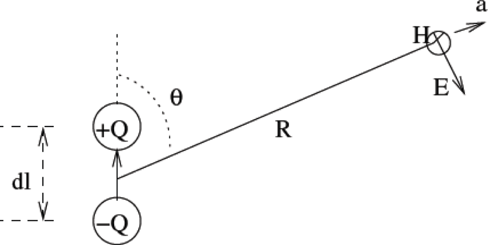 [] at frequency ω, as shown in Figure 8. The dipole consists of a short conducting wire of length dl, terminated in two small conductive spheres or disks. Assume that the current I is uniform and varies sinusoidally with time []. The electromagnetic field at a distance ‘R’ for an Hertzian dipole is derived from the vector potential A, given by []: