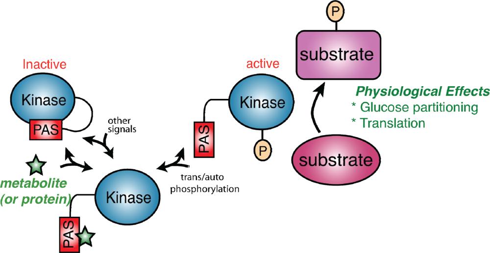A model for PAS kinase regulation and function. The PAS domain binds to and inhibits the kinase domain. A metabolite (green star) or protein activates PAS kinase by binding to the PAS domain and relieving PAS domain inhibition. This transient activation may be subsequently stabilized through auto- or transphosphorylation. PAS kinase is then competent to phosphorylate substrates involved in glucose partitioning and translation (in S. cerevisiae) to elicit the appropriate physiological response.
