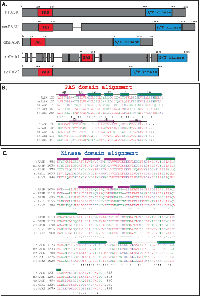Alignment of the PAS and kinase domains from selected PAS kinase orthologs. (A) Schematic of PAS kinase homologs. Regions of similarity are boxed in grey, with non-homologous regions indicated by gaps between the grey boxes. Alignment of the PAS (B) and kinase (C) domains from selected PAS kinase orthologs. Secondary structure elements (α-helical and β-sheet) were derived from the published NMR structure of the PAS domain [] as well as amino acid alignment of the kinase domain with the published structure of microtubule-associate protein/microtubule affinity regulating kinase 2 (MARK2) [], and are shown above the amino acids in green and purple respectively. Amino acid sequences were aligned using the Clustal W program []. The degree of amino acid conservation is indicated both by color and “*” (identical residues in all sequences), “:” (highly conserved amino acids), and “.” (weakly conserved amino acids). Red indicates a small hydrophobic or aromatic amino acid (-Y), blue indicates acidic, magenta is basic, and green is hydroxyl plus amine plus basic (-Q), all other amino acids are grey.