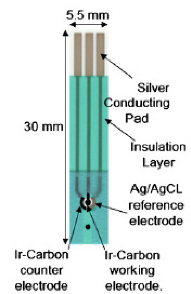 This single use, disposable biosensor consisted of three sensing electrode elements: a Ag/AgCl reference electrode (printed using an Ag/AgCl thick film ink), an iridium-containing carbon working electrode, an iridium-containing carbon counter electrode and the sensor was fabricated by the thick-film screen printing using a multi-layer printing approach. The overall dimension of this single-use, disposable DG biosensor was 30 mm × 5.5 mm and the working electrode was 1 mm in diameter. Figure 1 shows the configuration of the single use, disposable biosensor. The physical structure and the preparation of the printable ink for the manufacturing of this basic sensor have been described in details elsewhere [27,29].