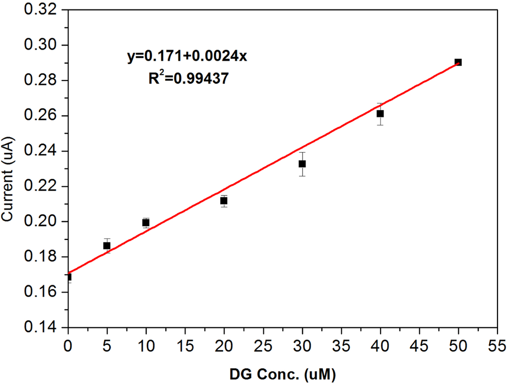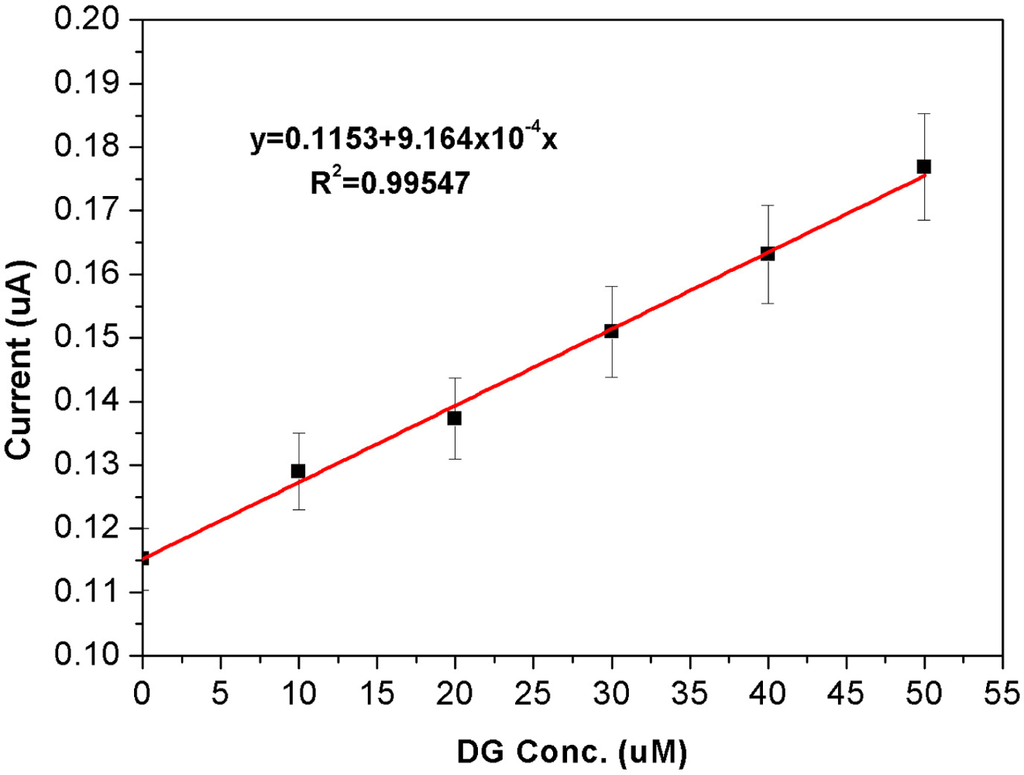 Calibration curve obtained at 300 s for the DG measurement in the 0.1 M pH 8.3 phosphate buffer.Good linear relationship is between response current and DG concentration is observed with a general equation of Y = 9.164 × 10−4X + 0.1153 and R2 = 0.995.