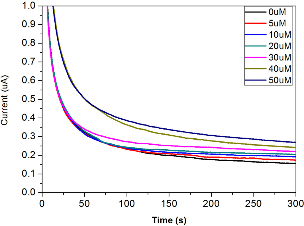 The results show a clear trend in response current versus DG concentration. Thus successful detection of DG using the disposable biosensor was accomplished. A calibration curve obtained by plotting the response current at 300 s versus DG concentration is shown in Figure 10.
