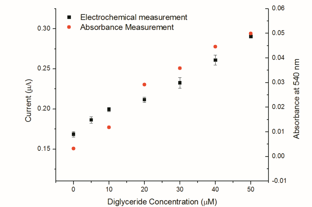 The comparison shows that good linear performance is observed in both measurement techniques. Based on these results, one can reasonably suggest that this single-use biosensor would be suitable as a potential replacement to spectrophotometric measurement of DG in serum.