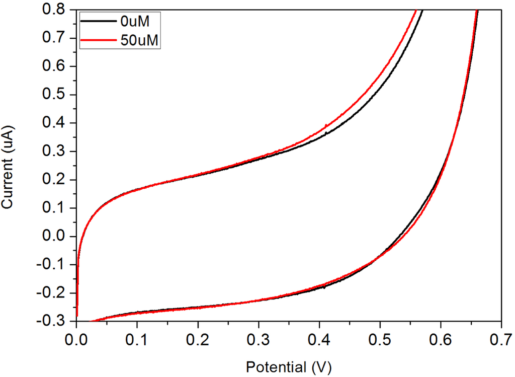 Cyclic-voltammagrams of the disposable biosensor showing the background current and the response current for a 50 μM solution using the disposable biosensor.