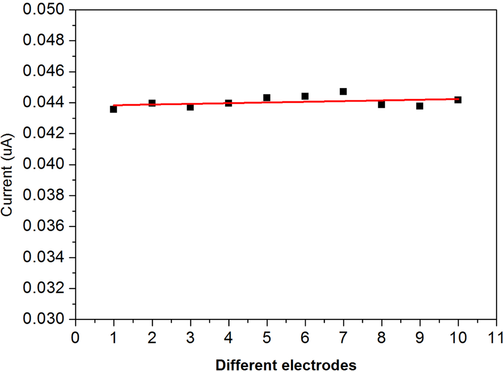The importance of a single use, disposable biosensor includes the high degree of sensitivity and reproducibility of the performance of the biosensor. Furthermore, the biosensor must be able to be produced cost-effectively in order to be a practical single use, disposable prototype. The reproducibility of the biosensor performance was assessed using a randomly selected group of fabricated individual biosensor prototypes. In order to investigate the repeatability of the disposable biosensors, replicate testing was performed. The reproducibility of this disposable biosensor for the detection to a fixed concentration of 5 μM of DG is shown in Figure 3. Testing was conducted by individually applying 6 μL of test solution to each sensor and evaluating the performance at +0.5 V, versus Ag/AgCl reference electrode.