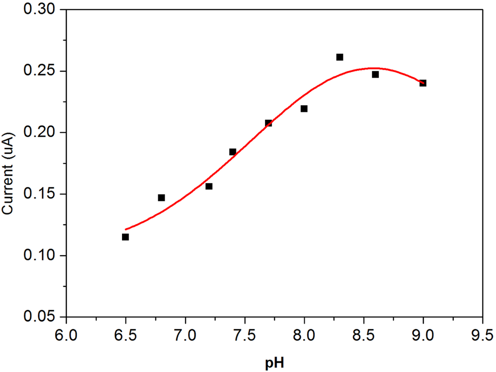 The oxidation current generated by the biosensor prototype based on Equation (2,3) at a fixed DG concentration of 30 μM DG was then measured as a function of pH value in the test medium 0.1 M PBS. Figure 4 shows the effect of the pH value of the test medium of DG detection using this biosensor prototype.