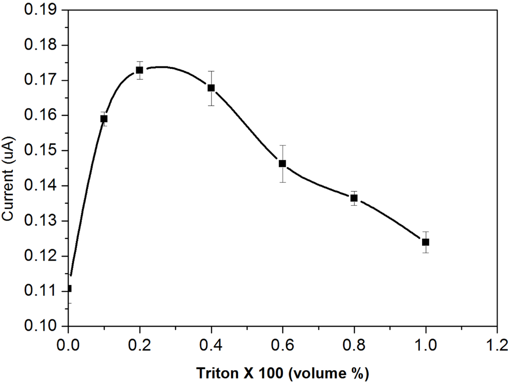 As mentioned, DG is a glyceride consisting of two fatty acid chains covalently bonded to a glycerol molecule through ester linkages thus making it a non-polar, hydrophobic molecule. The enzymatic reactions [33,34] for detecting the DG may take place at the interface between DG and the aqueous solution. Because of the poor solubility of DG in aqueous solution, the mechanism in which lipase reacts with DG can be regarded as a bi-molecular reaction of enzyme and the relevant surface ligand, which is a heterogeneous, time-consuming reaction [35,36]. Therefore, in order to enhance mixing a surfactant has been suggested to reduce the surface tension of water by adsorbing at the liquid-liquid interface [37]. The surfactant used in this study was Triton X-100 (t-Octylphenoxypolyethoxyethanol). A study on the effect of the surfactant concentration on the DG detection was conducted. Similar to the experimental protocol described previously, the enzyme GPO was immobilized on the working electrode surface.