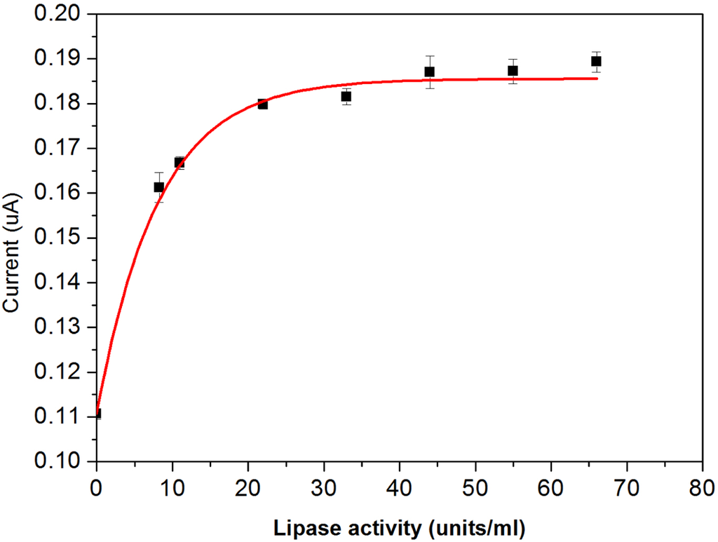 The response current increases with an increase of lipase addition, leveling off at about 22U mL−1. Hence, for further studies 22U mL−1 was used for completion of the hydrolysis of the DG in 1 h.