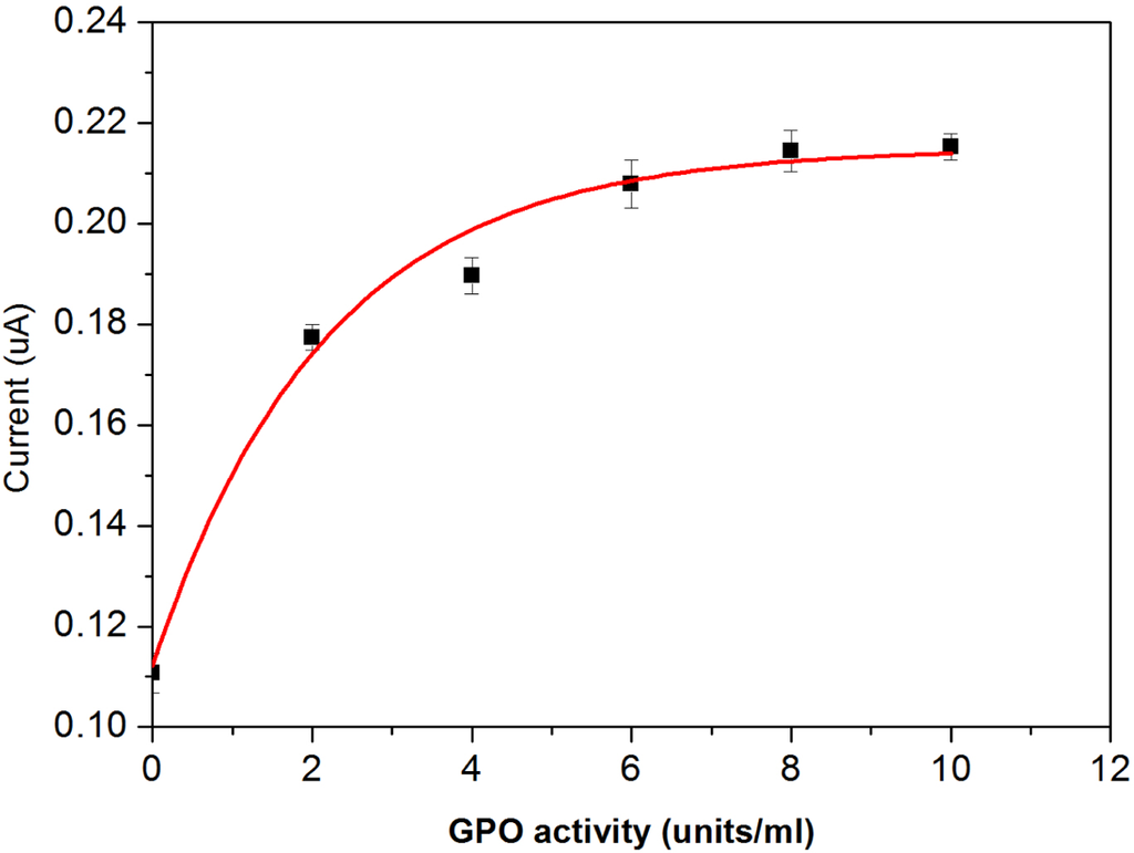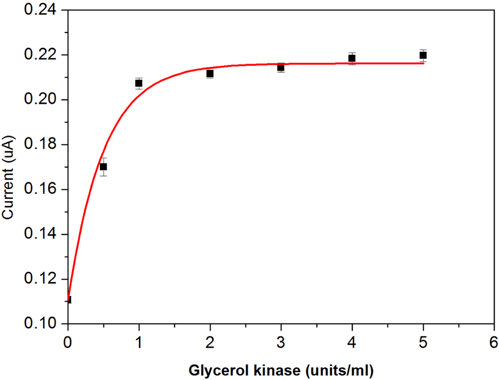 The optimum activities of both the soluble glycerol kinase and the immobilized glycerol 3-phosphate oxidase on the working electrode were experimentally assessed similarly. As anticipated, the response current increases with an increase in glycerol kinase addition, as shown in Figure 7.