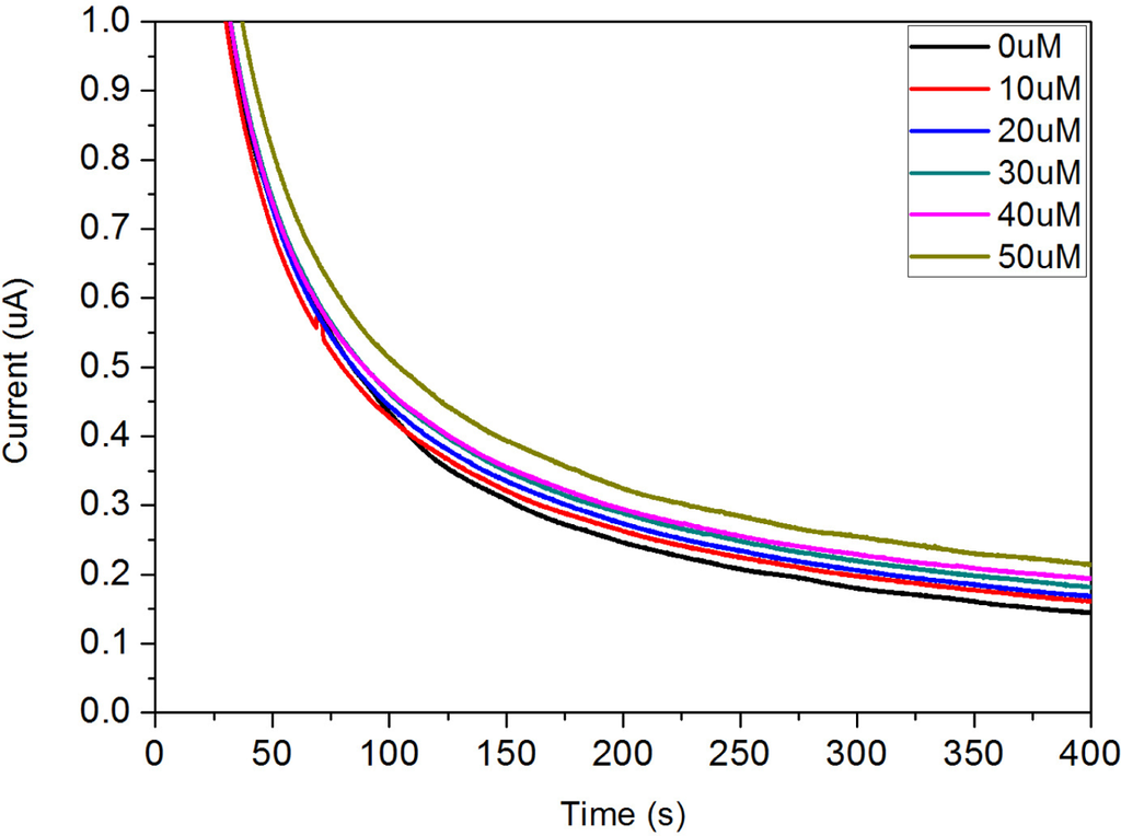 The testing range of DG concentration from 0 to 50 μM in bovine serum was also examined. However, a well fit trend of response current was only suitable up to a concentration of 30 μM (data not shown). To extend the testing range the bovine serum was diluted and the trend of response current was studied. In this study a 1:1 dilution of bovine serum-buffer was chosen. BSA was also added into the test medium because the bovine serum has many miscellaneous proteins. The dependence of the amperometric response for this single use, disposable biosensor on the different concentrations of DG is shown in Figure 11.