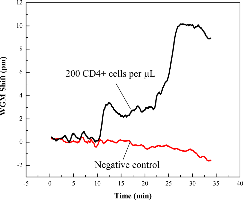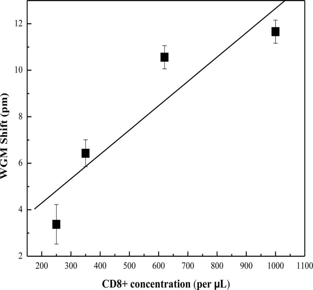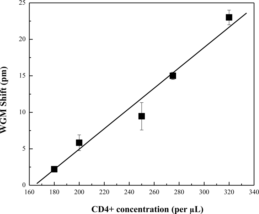 After surface functionalization, the OFRR was rinsed with PBS buffer and prepared for CD4+ and CD8+ measurements. White blood cells were isolated from healthy whole blood using a centrifuge. The concentrations of white blood cells were verified using a hemacytometer then adjusted to match CD4+ and CD8+ concentrations of HIV infected individuals. Targeted to the receptors were CD4+ and CD8+ antibodies immobilized in the microfluidic channel of the OFRR. The lymphocyte cells were prepared in PBS buffer at varying concentrations. In each measurement, concentrations of lymphocytes in PBS were passed through the OFRR followed by a PBS rinse to remove unbound cells from the OFRR surface. Anti-CD4 antibody is specific to the CD4+ receptor located on CD4+ Lymphocyte T-helper cells. Anti-CD8 antibody is specific to the CD8+ Cytotoxic T-cells. After each measurement cycle, the OFRR was cleaned with a 2% solution of HF to completely remove all of the functional and biomolecule layers for the surface. After washing, the OFRR can be prepped for the next measurement. The WGM spectral position was recorded and monitored in real time during the buildup of functional layers and receptor measurements. This data was utilized for post-experiment analysis.