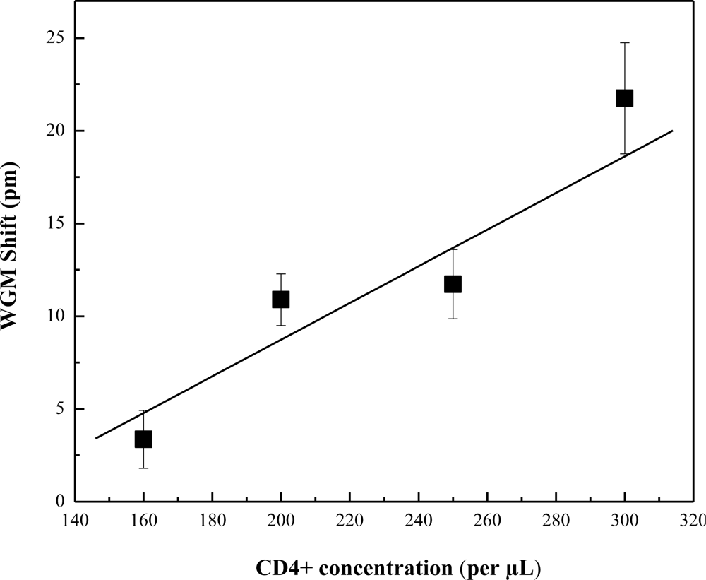 The OFRR was engaged for the real time detection of CD4+ T-Lymphocytes. The interior surface was functionalized using the procedure described in the experimental section. A detection baseline was created by running PBS buffer through the OFRR. Lymphocyte cell concentrations were verified using a hemacytometer and microscope. A level of cell viability was assessed by staining dead cells with Trypan Blue. It was found that in each experiment a high level of cell viability was present. After concentrations of lymphocytes were measured, they were diluted to standard concentrations in medically significant ranges pertaining to individuals infected with HIV. The concentrations chosen were approximately 160, 200, 250, and 300 cells per μL. The resulting WGM spectral shift was recorded for each concentration and range was established based on multiple tests. Figure 2 shows one of the sensorgrams when CD4+ cells bind to the OFRR inner surface. During the test, sample flowing through the OFRR was held constant by the syringe pump at 1 μL/min. The whole test was terminated after approximately 30 minutes. The sensorgram exhibits much larger fluctuations in the sensing signal (i.e., the WGM spectral shift) than normally seen in detection of DNA or protein. This is caused by the non-uniform nature of cell binding processes, as compared to the binding of biomolecules. In order to establish the specificity of CD4+ T-Lymphocyte binding to the OFRR sensing region, we ran a negative control consisting of diluted serum and red blood cells in PBS buffer. Figure 3 shows the resulting spectral shift ranges at varying concentrations. It is seen that the sensing signal is linearly dependent upon the cell concentration, although error bars are relatively large due once again to the nature of the cell binding.