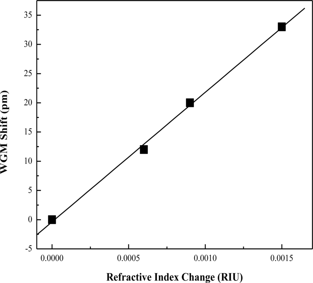 OFRR devices achieve label free sensing by detecting the refractive index (RI) changes in the microfluidic channel. This change in RI can be caused by a change in the overall fluid in the core or a buildup of biomolecules on the surface of the channel. The relationship between the spectral shift of the WGM and the RI of the microfluidic core is shown mathematically by [17–19]: