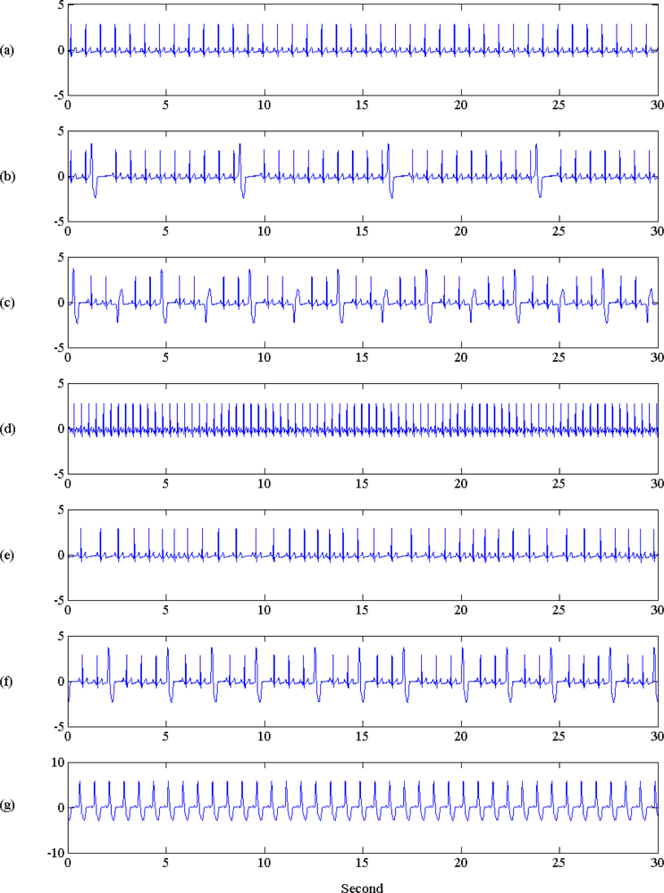 Illustration of normal and arrhythmia ECG signals used in this study. Signal durations are 30 s. From top to bottom: (a) normal ECG, (b) premature arrhythmia with PVC1, denoted as P1, (c) premature arrhythmia with multifocal PVC, denoted as P2, (d) superavent arrhythmia with atrial tach, denoted as S1, (e) superavent arrhythmia with sinus arrhythmia, denoted as S2, (f) ventricular arrhythmia with 24 PVCs per min, denoted as V1, (g) conduction arrhythmia with Lf bundle branch block, denoted as C1.