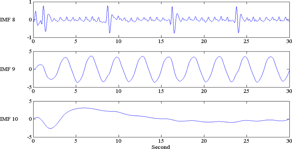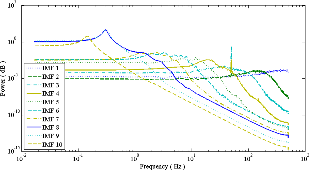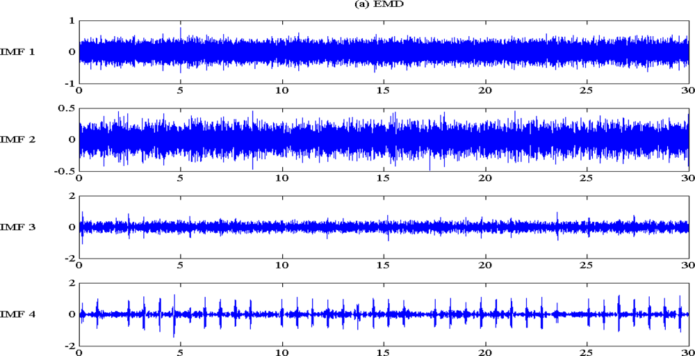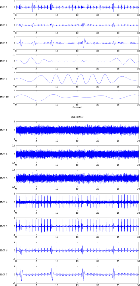 The typical EMD and EEMD decomposition and extracted IMF are illustrated in Figure 4. The low level IMF contained high frequency components; while the high level IMF contained low frequency components. IMF distribution is very similar to a filter bank. Unlike a traditional filter bank, and similar sub-band decomposition algorithms, such as wavelets, IMF is not band restricted. Adaptive decomposition based on the signal pattern complexity is the main feature of IMF. Not specific IMF level would contain pre-determined frequency range components, that means an adaptive frequency range filtering process.