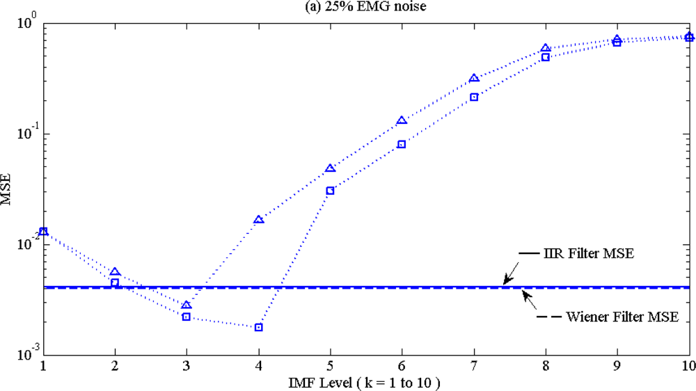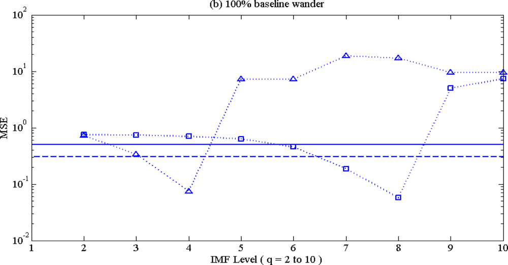 The detailed MSE values for synthetic ECG are listed in Table 1. From the results of Table 1, EEMD performed better with light noise percentage, and also better on baseline wander than on high frequency noise, both on 50 Hz interference and EMG noise.