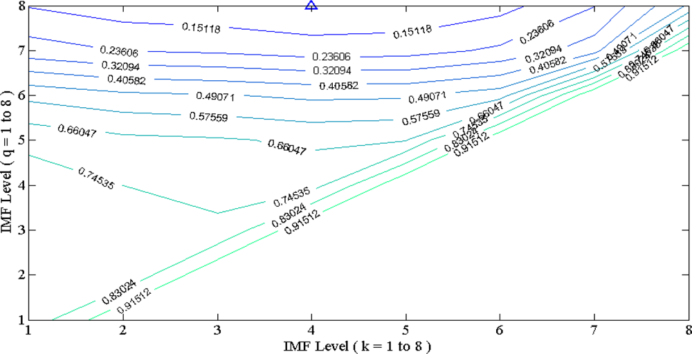 EMD and EEMD based band pass filter need the reduction of both high level and low level IMF, and optimally the middle part of IMF would be conserved, that corresponds to the clean ECG component. Sequential search of MSE with all possible (k,q) combinations was evaluated. A contour map with x-axis as k and y-axis as q was sketched. A minimum MSE point to indicated the optimal (k,q) pair location is achieved for the optimal band pass filtering performance and is illustrated in Figure 7.
